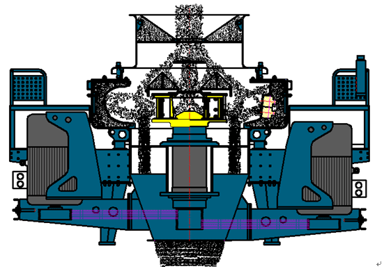 基本工作原理與中心進料伴隨瀑落料”石打石“相同,不同的是完全中心進料時將散料錐卸掉,石料全部從進料口直接落入分料盤中,經(jīng)分料盤中間直接落入粉料盤中,經(jīng)粉料盤中間直接進入甩輪中。