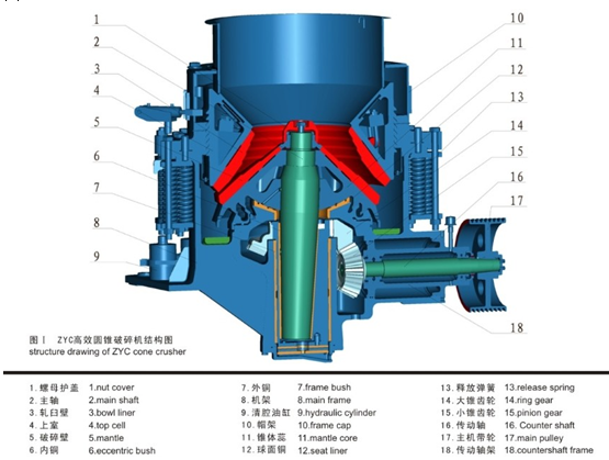 破碎腔:兩個破碎元件形成的空間內部結構,是圓錐破碎機破碎物料的地方;