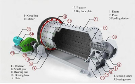 球磨機(jī)的基本原理是利用傳動機(jī)械帶動筒體旋轉(zhuǎn),物料從給礦處給入,在離心力的作用下,使筒體內(nèi)鋼球、物料與襯板之間發(fā)生撞擊、磨剝、摩擦等作功,完成物料磨粉作業(yè)。